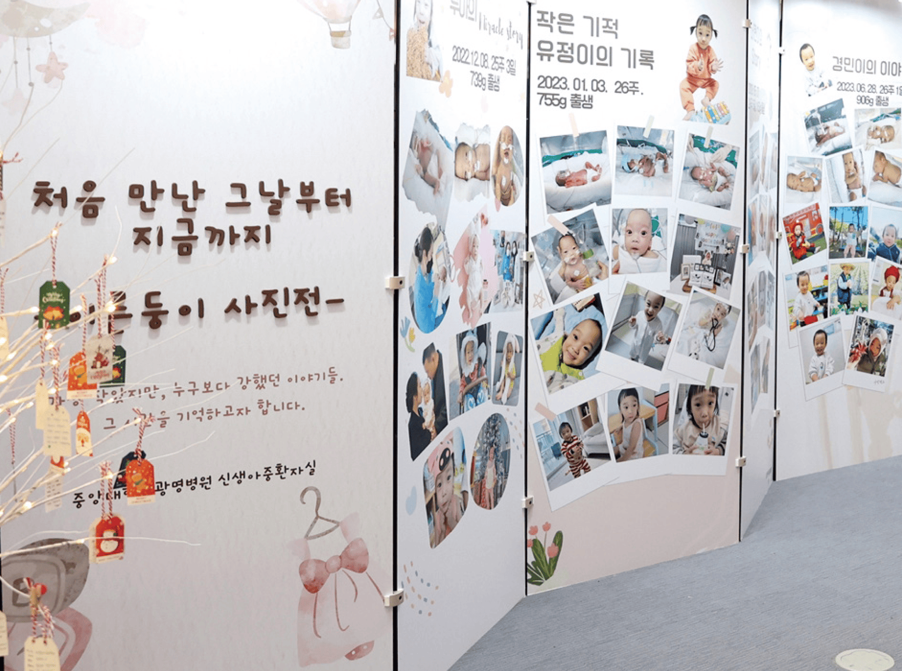 중앙대광명병원은 지난해 12월 22일부터 올해 1월 2일까지 1층 로비에서 ‘이른둥이 사진전’을 개최했다. ‘처음 만난 그날부터 지금까지’를 주제로 열린 사진전은 신생아중환자실에 입원했던 환아 8명의 성장 과정을 담은 사진들로 구성됐다. 소아청소년과 신생아중환자실이 주관한 이번 사진전은 많은 내원객들의 발길을 이끌며 뜨거운 호응을 얻었다